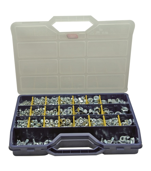 Handige assortimentsdoos gevuld met verschillende maten borg- dop- en vleugelmoeren.