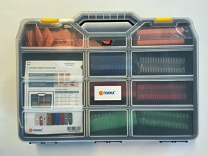 Uitvulplaatjes met stelpootjes en gaatjes in assortimentskoffer. Ideaal voor het uitvoeren van diverse stelwerkzaamheden bij vloeren, kozijnen, bouwelementen etc.