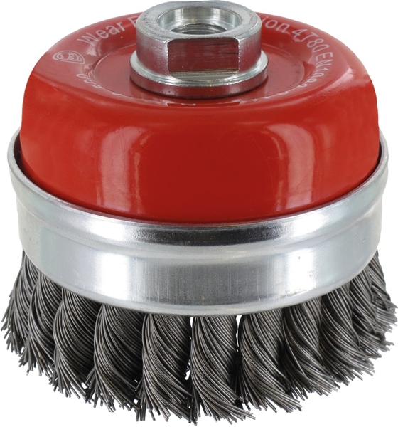 Getordeerd gehard kwaliteits staaldraad met beschermring. Nadat de draden tot aan de beschermring zijn afgesleten kan de ring worden verwijderd en het resterende draad van de borstel worden opgebruikt.