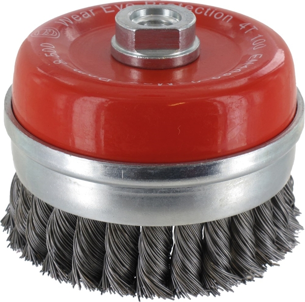 Getordeerd gehard kwaliteits staaldraad met beschermring. Nadat de draden tot aan de beschermring zijn afgesleten kan de ring worden verwijderd en het resterende draad van de borstel worden opgebruikt.