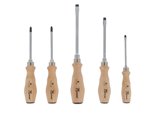 Ivana schroevendraaierset hout voor alle toepassingen in houtbewerking. Met gelakt beukenhouten handvat met ergonomische grip, anti-rol beveiliging, volledig in lengte doorlopend verchroomd mes met zwarte tip en een zeskant aanzet.