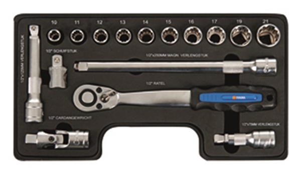 - 10 doppen (10, 11, 12, 13, 14, 15, 16, 17, 19 en 21 mm)