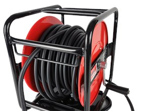 Luchtslanghaspel met draaibare voet, stalen frame en stalen spoel, met inklapbare zwengel.