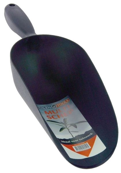 Deze kunststof Multischep kan voor verschillende doeleinden gebruikt worden, zoals het verplaatsen van grond en het strooien van zout.