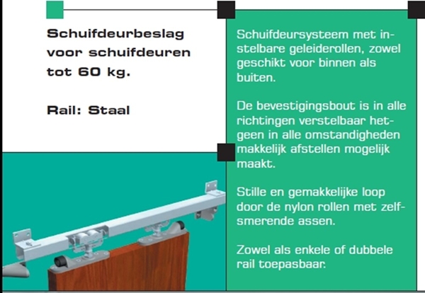 Schuifdeurbeslag voor schuifdeuren tot 60 kg.