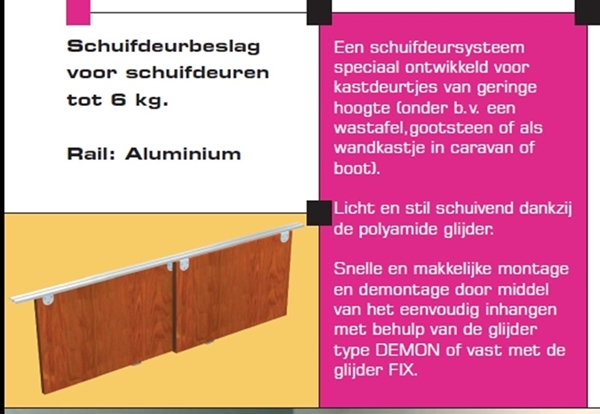 Een schuifdeursysteem speciaal ontwikkeld voor kastdeurtjes van geringe hoogte (onder b.v. een wastafel,gootsteen of als wandkastje in caravan of boot).