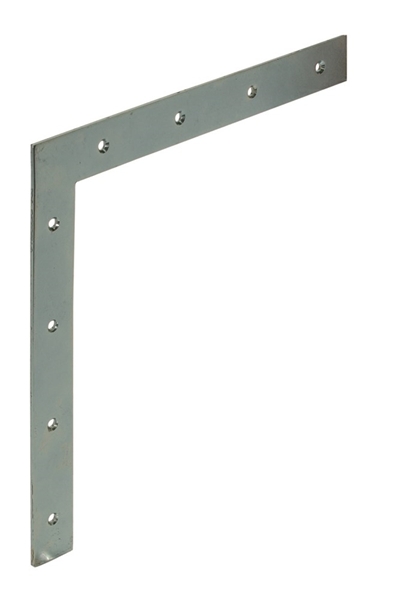 Hoek, rechte uitvoering met (verzonken) schroefgaatjes, om een haakse houtverbinding te versterken. Leverbaar in verschillende maten en uitvoeringen.