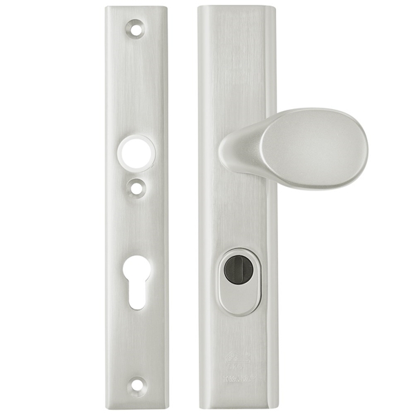 Aluminium veiligheidsgarnituur voorzien van kerntrekbeveiliging. Deze extra toevoeging aan het beslag zorgt ervoor dat de cilinder volledig afgeschermd is, deze is daardoor beschermd tegen uitboren of uittrekken.