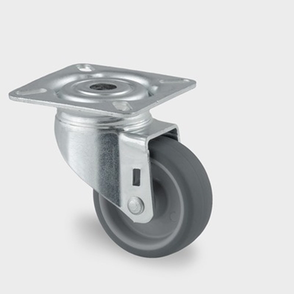 Zwenkwiel, vork van geperst staal, verzinkt, dubbele kogeldraaikrans in de zwenkkop, plaatbevestiging. Wielkern van polypropyleen met grijze niet-strepende TENTEprene thermoplastische rubberband, wielnaaf op precisiekogellager, met afdekkappen, m.u.v. 50 mm. wiel