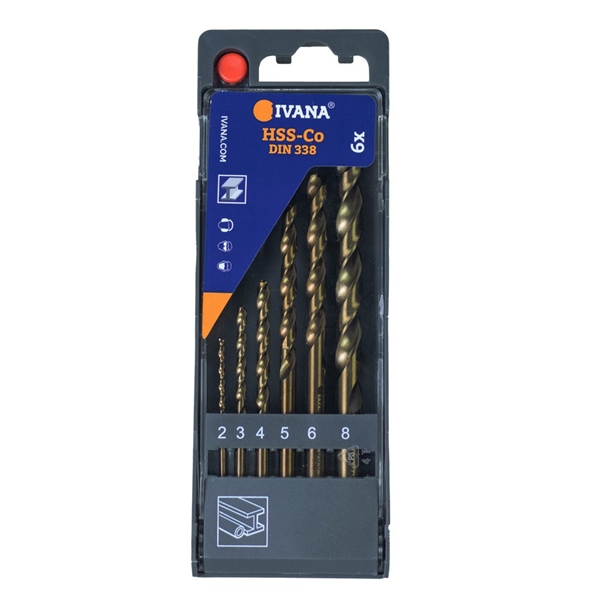 6-delige set van HSS-Co spiraalboren Ø2,3,4,5,6,8 mm DIN 338. Type N spiraal, geslepen uitvoering, cobalt gelegeerd, goudkleurig, tophoek 135°, met splitpoint / kruisaanslijping (DIN 1412-C). Voor het boren van moeilijk te verspanen staalsoorten, austenitisch Cr-Ni roestvaststaal, verenstaal, mangaanstaal, kortspanige staalsoorten met een treksterkte < 1.000 N/mm², etc.
