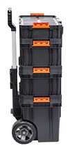 De compacte mobiele werkplaats met veel opbergruimte voor klein gereedschap en accessoires. Voorzien van stevige connectors, een telescoop handvat en grote wielen met metalen as.